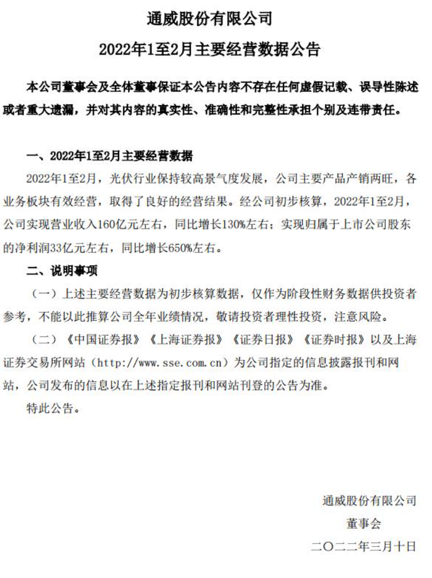 3月9日 通威股份公告,經(jīng)公司初步核算,2022年1至2月,公司實(shí)現(xiàn)營(yíng)業(yè)收入160億元左右,同比增長(zhǎng)130%左右;實(shí)現(xiàn)歸屬于上市公司股東的凈利潤(rùn)33億元左右,同比增長(zhǎng)650%左右。光伏行業(yè)保持較高景氣度發(fā)展,公司主要產(chǎn)品產(chǎn)銷兩旺,各業(yè)務(wù)板塊有效經(jīng)營(yíng),取得了良好的經(jīng)營(yíng)結(jié)果。此次公告是通威股份歷史首次公布月度主要經(jīng)營(yíng)數(shù)