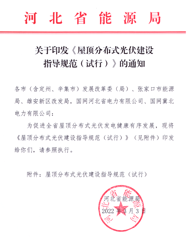 3月16日,河北省能源局印發(fā)《屋頂分布式光伏建設指導規(guī)范(試行)》,規(guī)定了屋頂分布式光伏項目工作流程、規(guī)劃要求、項目立項、本體設計、接網設計、工程建設、并網調試、工程驗收、調控與保護、運行維護、交易結算、用電監(jiān)察、項目評價等應遵循的基本要求。