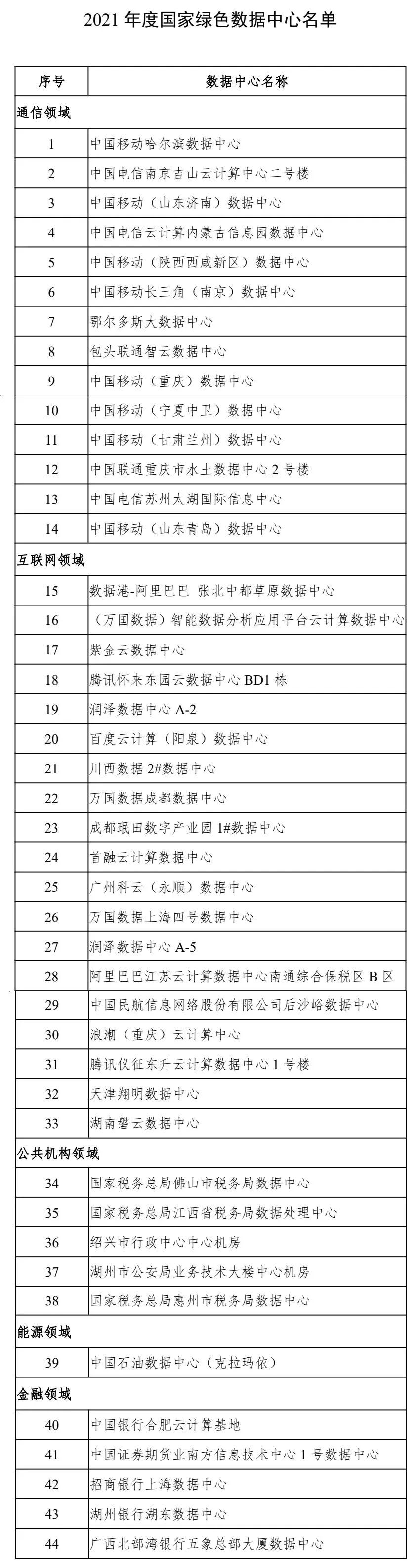 為加快數(shù)據(jù)中心節(jié)能和能效提升,引導(dǎo)數(shù)據(jù)中心走高效、低碳、集約、循環(huán)的綠色發(fā)展道路,助力實(shí)現(xiàn)碳達(dá)峰、碳中和目標(biāo),日前,工信部、國(guó)家發(fā)改委、商務(wù)部、國(guó)家機(jī)關(guān)事務(wù)管理局、中國(guó)銀保監(jiān)會(huì)、國(guó)家能源局確定了44家2021年度國(guó)家綠色數(shù)據(jù)中心。