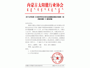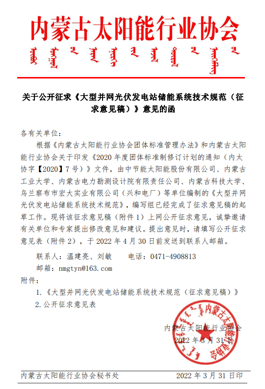 日前,內(nèi)蒙古太陽(yáng)能行業(yè)協(xié)會(huì)印發(fā)關(guān)于公開征求《大型并網(wǎng)光伏發(fā)電站儲(chǔ)能系統(tǒng)技術(shù)規(guī)范(征求意見稿)》意見的函,由中節(jié)能太陽(yáng)能股份有限公司、內(nèi)蒙古工業(yè)大學(xué)、內(nèi)蒙古電力勘測(cè)設(shè)計(jì)院有限責(zé)任公司、內(nèi)蒙古科技大學(xué)、烏蘭察布市宏大實(shí)業(yè)有限公司(興和電廠)等單位編制的《大型并網(wǎng)光伏發(fā)電站儲(chǔ)能系統(tǒng)技術(shù)規(guī)范》,編寫組已經(jīng)完成了征求意見稿的起草工作,現(xiàn)將該征求意見稿(附件1)上網(wǎng)公開征求意見,誠(chéng)摯邀請(qǐng)有關(guān)單位和專家提出修改意見和建議。