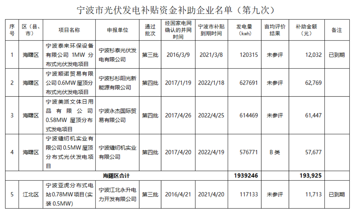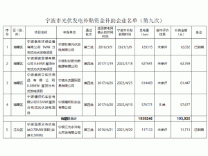 寧波市第九次光伏發(fā)電補(bǔ)貼補(bǔ)助企業(yè)名單公布