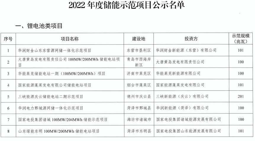 從山東省能源局獲悉: 日前,山東省能源局發(fā)布關(guān)于2022年度儲(chǔ)能示范項(xiàng)目的公示,根據(jù)《關(guān)于開展2022年度儲(chǔ)能示范項(xiàng)目遴選工作的通知》精神,經(jīng)各市推薦和專家評(píng)審,擬將25個(gè)鋰電池類項(xiàng)目、4個(gè)新技術(shù)類項(xiàng)目列為2022年度儲(chǔ)能示范項(xiàng)目予以公示。公示時(shí)間為2022年4月7日至4月13日。