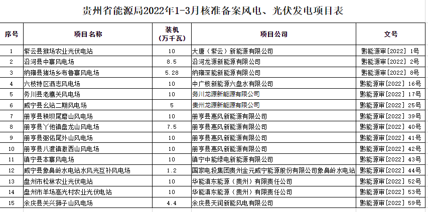 根據《省人民政府關于印發(fā)貴州省企業(yè)投資項目核準和備案管理辦法的通知》(黔府發(fā)〔2018〕第7號),按照程序,貴州省能源局2022年1-3月核準備案風電、光伏發(fā)電項目15個,現將有關情況公布如下。