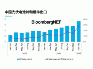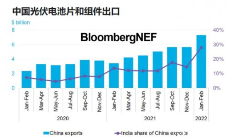 2022年前兩個月,中國光伏電池片和組件出口額達(dá)73億美元,創(chuàng)下紀(jì)錄高點。印度首次成為中國光伏產(chǎn)品的最大買家,在2022年2月占中國總出貨量的近三分之一。