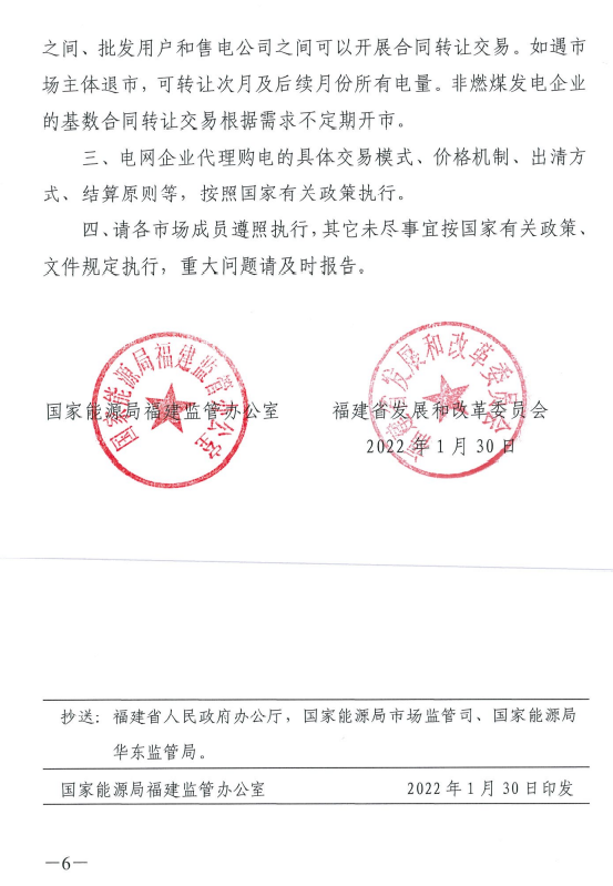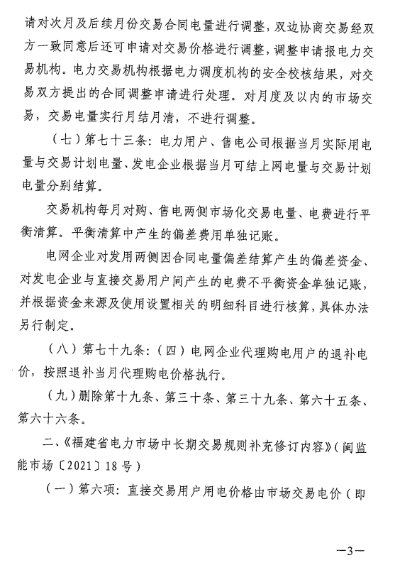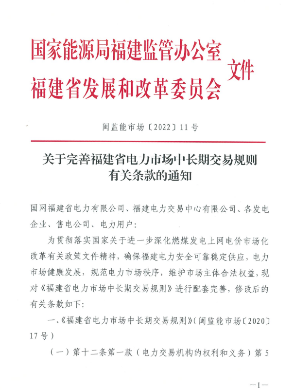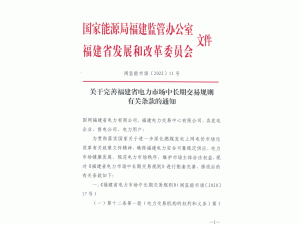 國(guó)家能源局福建監(jiān)管辦公室 福建省發(fā)展和改革委員會(huì)日前印發(fā)關(guān)于完善福建省電力市場(chǎng)中長(zhǎng)期交易規(guī)則有關(guān)條款的通知,全文如下: