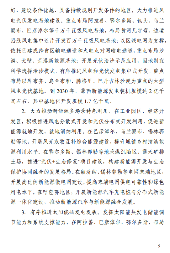 其中,在新能源建設(shè)躍升行動(dòng)中,《方案》提出重點(diǎn)建設(shè)國(guó)家級(jí)風(fēng)電光伏基地。在風(fēng)能和太陽(yáng)能資源稟賦較好、建設(shè)條件優(yōu)越、具備持續(xù)規(guī)劃開(kāi)發(fā)條件的地區(qū),大力推進(jìn)風(fēng)電光伏發(fā)電基地建設(shè)。重點(diǎn)布局阿拉善、鄂爾多斯、包頭、烏蘭察布、巴彥淖爾等千萬(wàn)千瓦級(jí)風(fēng)電基地,布局黃河幾字彎、邊境沿線風(fēng)電集中連片開(kāi)發(fā)百萬(wàn)千瓦級(jí)風(fēng)電基地;以區(qū)域電網(wǎng)為支撐,依托已建成跨省區(qū)輸電通道和火電點(diǎn)對(duì)網(wǎng)輸電通道,重點(diǎn)布局沙漠、戈壁、荒漠新能源基地;開(kāi)展光伏治沙示范應(yīng)用,因地制宜科學(xué)選擇治沙模式,有序推進(jìn)風(fēng)電和光伏發(fā)電集中式開(kāi)發(fā),重點(diǎn)布局以庫(kù)布齊、烏蘭布和、騰格里、巴丹吉林沙漠為重點(diǎn)的大型風(fēng)電光伏基地。到 2030 年,蒙西新能源發(fā)電裝機(jī)規(guī)模達(dá) 2 億千瓦左右,其中基地化開(kāi)發(fā)規(guī)模 1.7 億千瓦。