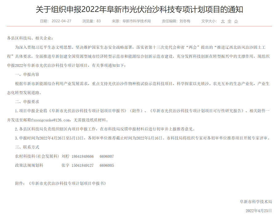 1.項目申報企業(yè)將《阜新市光伏治沙科技專項計劃項目申報書》(附件)、《阜新市光伏治沙科技專項計劃項目可行性研究報告》、相關(guān)附件一并發(fā)送至郵箱fxnongcunke@126.com,無需報送紙質(zhì)材料。