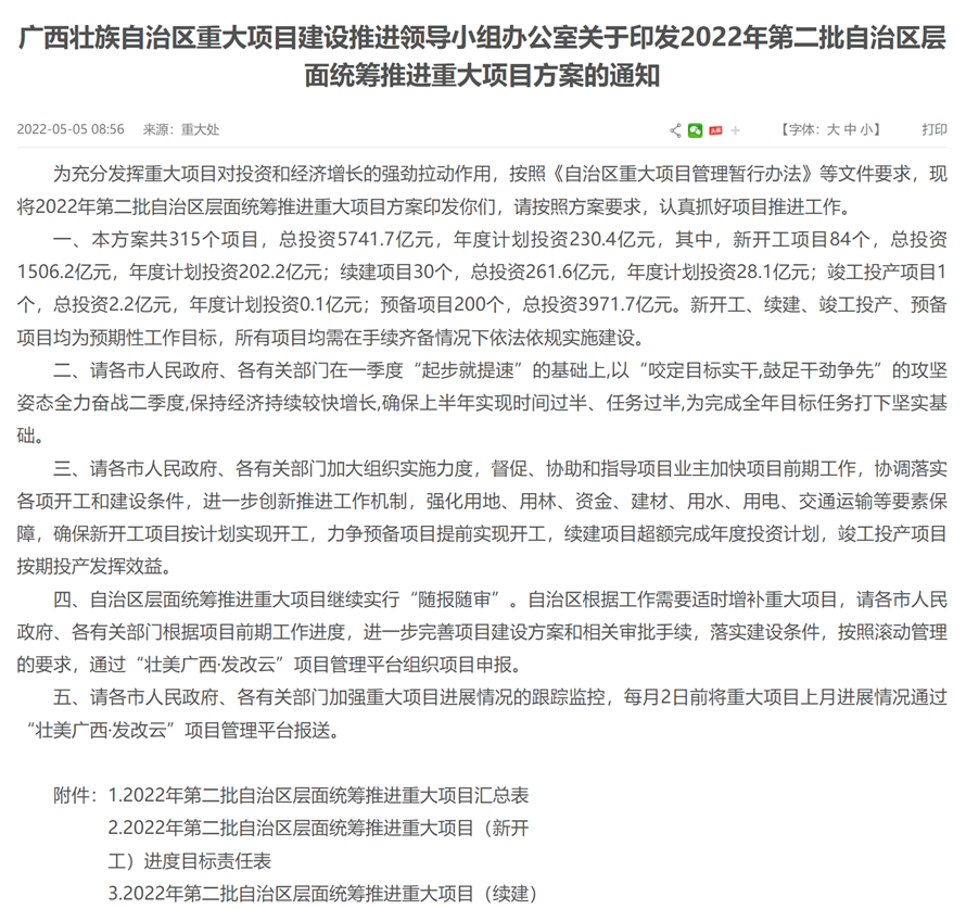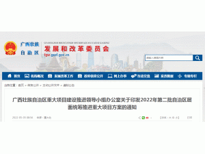 廣西壯族自治區(qū)重大項目建設推進領導小組辦公室近日印發(fā)2022年第二批自治區(qū)層面統(tǒng)籌推進重大項目方案,列入的重大項目共315個,總投資5741.7億元,年度計劃投資230.4億元。其中,光伏發(fā)電35個項目被納入方案,累計容量4003.06MW。