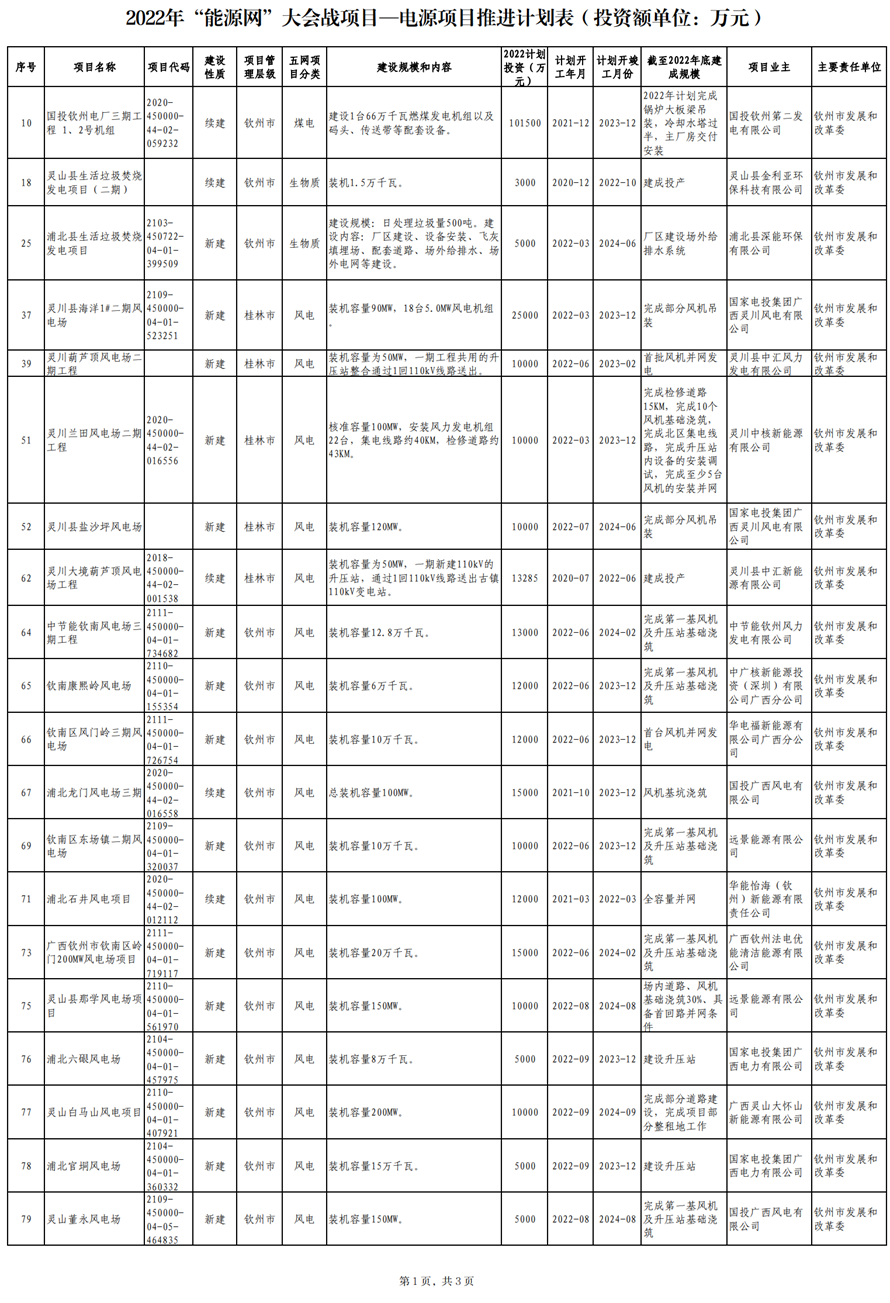 (一)加快電源建設(shè)。2022年共實施244個項目(包括風電、光伏發(fā)電、生物質(zhì)發(fā)電、水電、煤電、核電),其中新開工建設(shè)橫州市六景風光儲氫一體化示范項目、北海電廠二期等141個項目、續(xù)建防城港紅沙核電二期等113個項目。力爭實現(xiàn)廣西世紡?fù)顿Y集團有限公司熱電聯(lián)產(chǎn)項目、欽南區(qū)風門嶺風電場二期工程等86個項目年內(nèi)竣工投產(chǎn)。2022年計劃完成投資526.53億元。(詳見附表1)