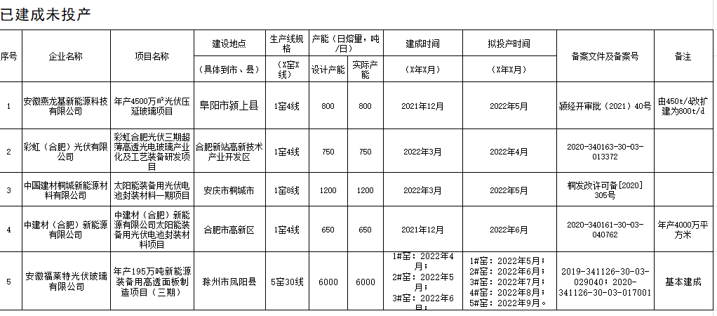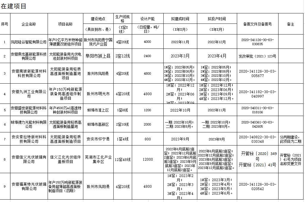 為貫徹落實(shí)《工業(yè)和信息化部關(guān)于印發(fā)水泥玻璃行業(yè)產(chǎn)能置換實(shí)施辦法的通知》文件精神,安徽省經(jīng)濟(jì)和信息化廳、安徽省發(fā)展改革委委托中國建筑玻璃與工業(yè)玻璃協(xié)會(huì)、中國建筑材料工業(yè)規(guī)劃研究院組織召開了信義光伏產(chǎn)業(yè)(安徽)控股有限公司等企業(yè)光伏壓延玻璃項(xiàng)目聽證會(huì),現(xiàn)對(duì)已建成投產(chǎn)(7個(gè))、建成未投產(chǎn)(5個(gè))、在建項(xiàng)目信息(9個(gè))予以公示,公示期為2022年5月7日至19日。