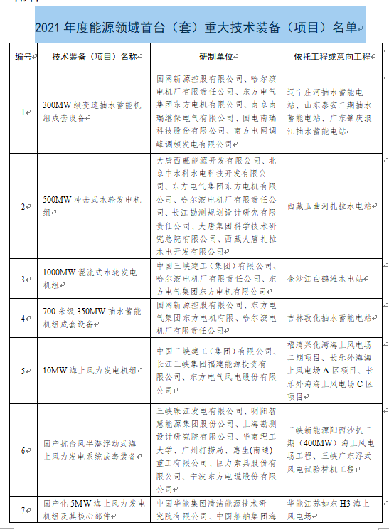 據(jù)國家能源局13日公告,為持續(xù)推進能源領(lǐng)域首臺(套)重大技術(shù)裝備示范應(yīng)用,加快能源重大技術(shù)裝備創(chuàng)新,切實保障關(guān)鍵技術(shù)裝備產(chǎn)業(yè)鏈供應(yīng)鏈安全,國家能源局組織了2021年度能源領(lǐng)域首臺(套)重大技術(shù)裝備申報及評定工作。根據(jù)各有關(guān)單位申請,經(jīng)組織專家評審和復(fù)核、公示,決定將“300MW級變速抽水蓄能機組成套設(shè)備”等75個技術(shù)裝備(項目)列為2021年度能源領(lǐng)域首臺(套)重大技術(shù)裝備項目。