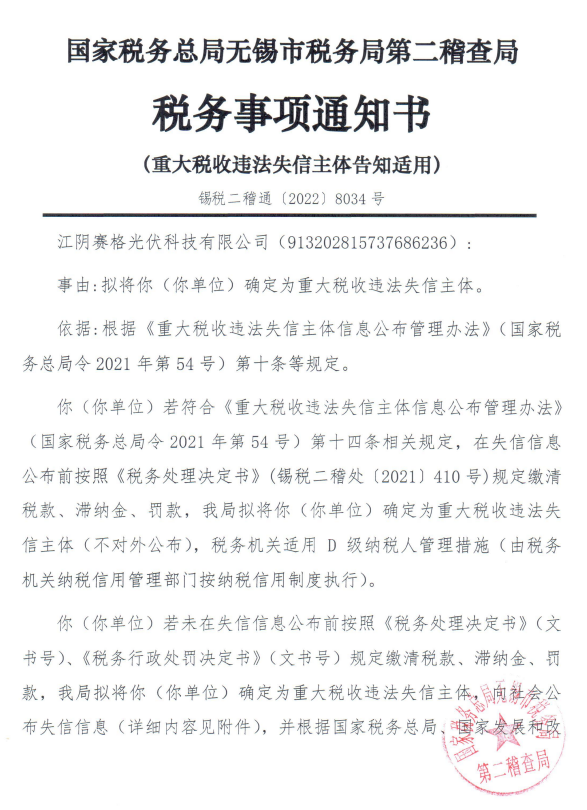關(guān)于送達(dá)稅務(wù)事項通知書(重大稅收違法失信主體告知適用)的通告(江陰賽格光伏科技有限公司)