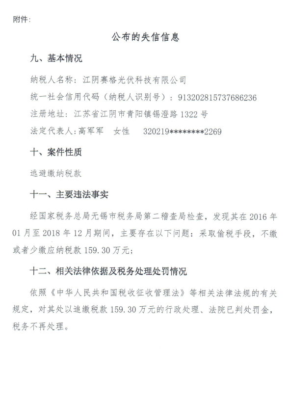 相關(guān)附件顯示,經(jīng)國家稅務(wù)總局無錫市稅務(wù)局第二稽查局檢查,發(fā)現(xiàn)江陰賽格光伏科技有限公司在2016年01月至2018年12月期間,主要存在以下問題:采取偷稅手段,不繳或者少繳應(yīng)納稅款159.30萬元。