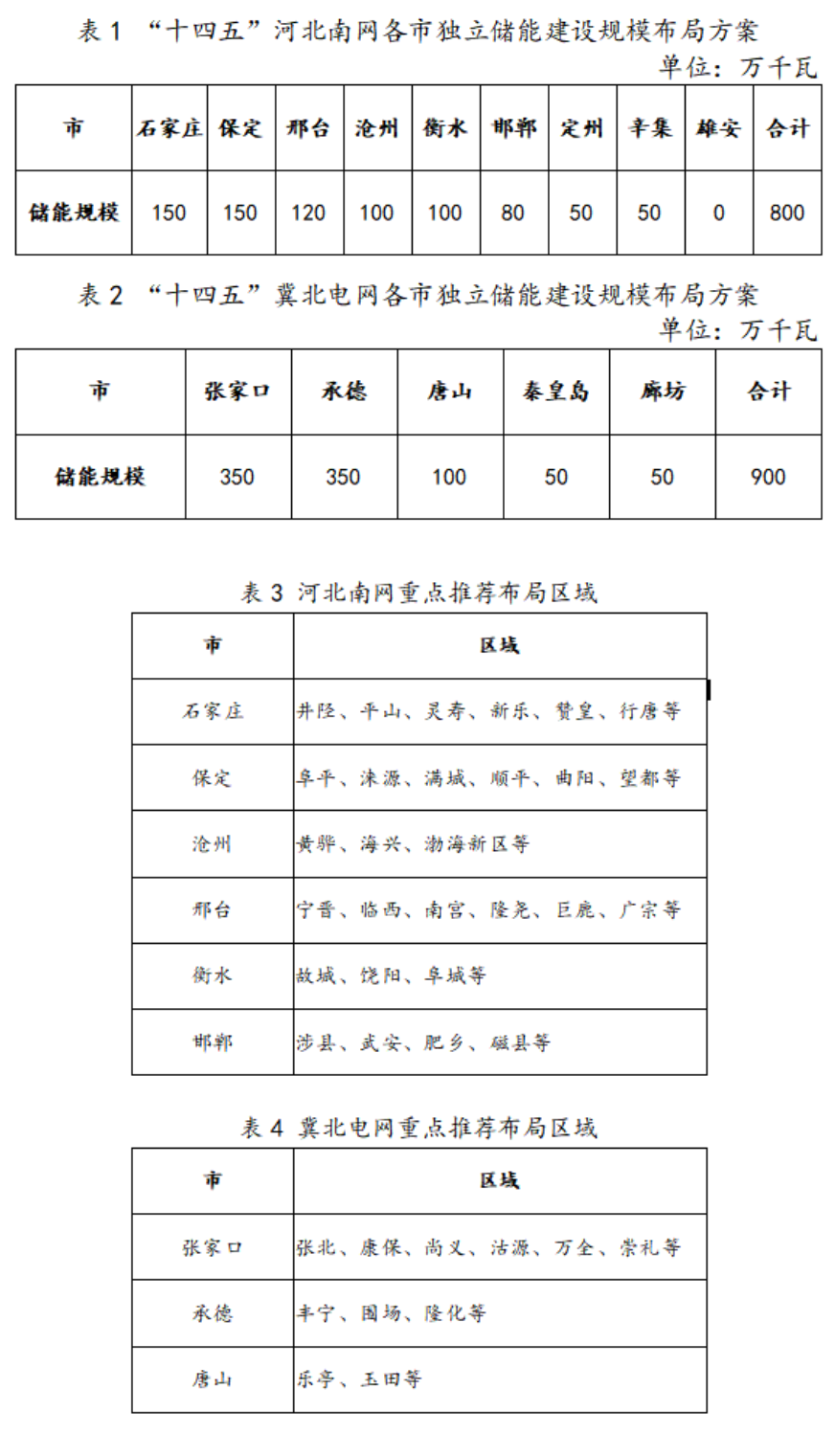 (二)冀北電網(wǎng)項目布局。冀北電網(wǎng)張承地區(qū)新能源裝機規(guī)模占比約90%,但電網(wǎng)網(wǎng)架相對薄弱,電力負荷相對偏低,調峰調頻矛盾突出,將張家口、承德地區(qū)作為獨立儲能項目布局的重點區(qū)域!笆奈濉睍r期,在張家口的張北、康保、尚義,承德的豐寧、圍場、隆化,唐山的樂亭、玉田等縣區(qū),共布局獨立儲能項目建設規(guī)模900萬千瓦(附表2、4)。
