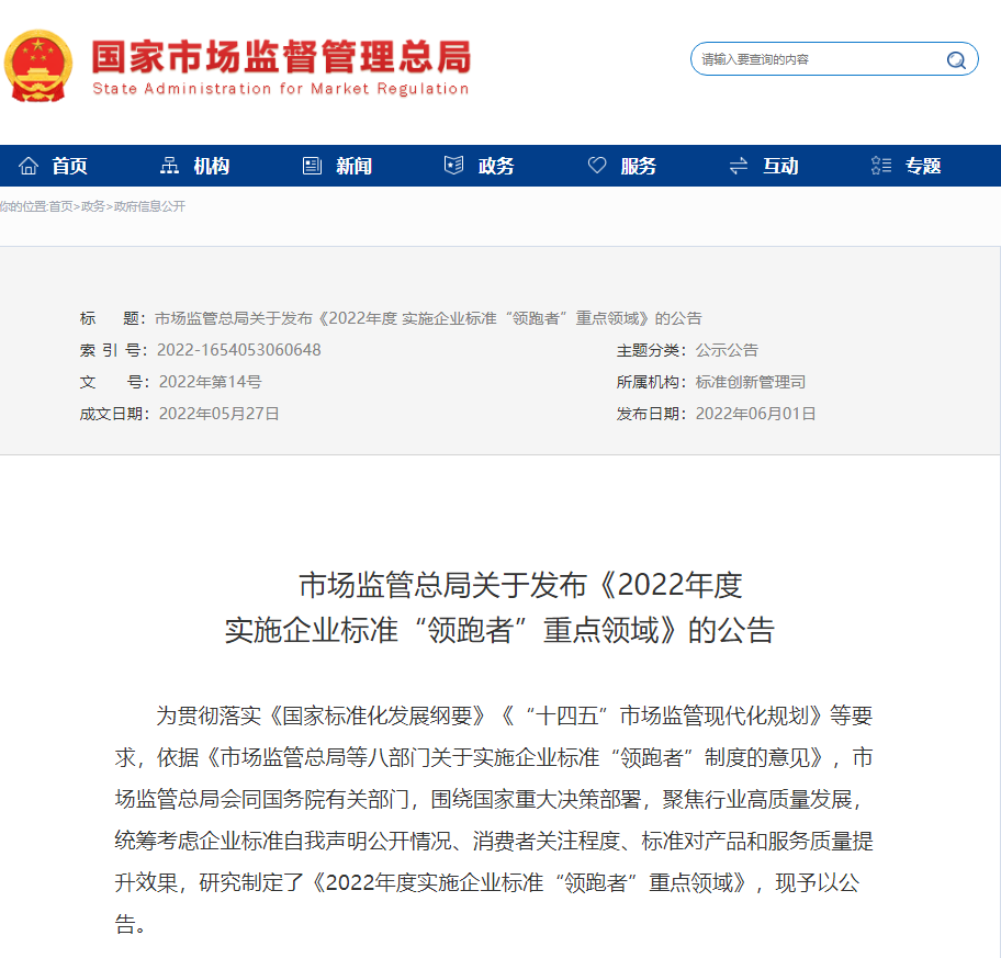 本年度企業(yè)標(biāo)準(zhǔn)“領(lǐng)跑者”重點領(lǐng)域公告和清單的發(fā)布標(biāo)志著2022年企業(yè)標(biāo)準(zhǔn)“領(lǐng)跑者”工作的正式啟動。