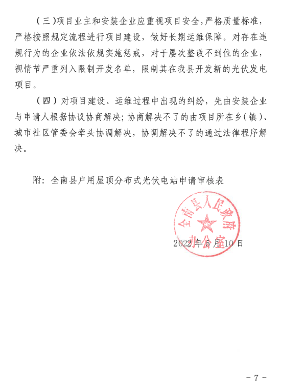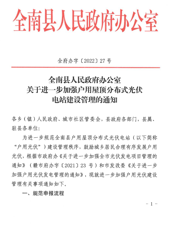 從全南縣政府網(wǎng)了解到,為進一步規(guī)范戶用屋頂分布式光伏電站建設(shè)管理秩序,鼓勵城鄉(xiāng)居民合理有序發(fā)展戶用光伏,近日,江西贛州市全南縣人民政府發(fā)布了《關(guān)于進一步加強戶用屋頂分布式光伏電站建設(shè)管理的通知》,強調(diào)規(guī)范建設(shè)管理,嚴禁以建設(shè)戶用光伏為由,利用組件下方四周進行圍合,在樓頂和平臺違法搭建采光房、鋼棚等違法建筑。