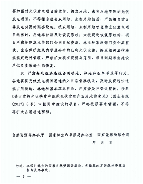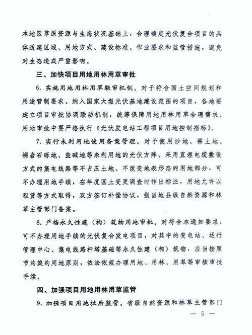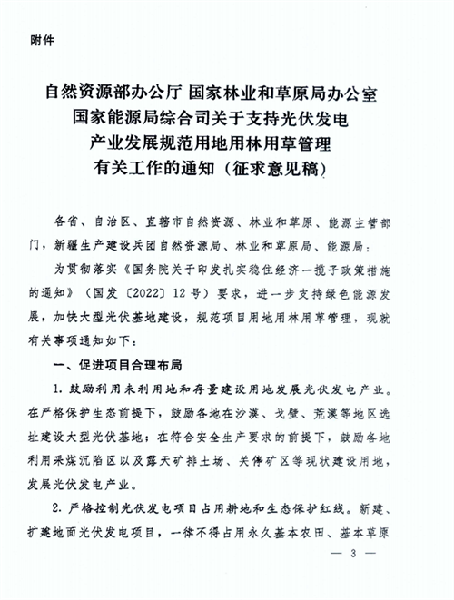 自然資源部辦公廳、國(guó)家林業(yè)和草原局辦公室、國(guó)家能源局綜合司近日聯(lián)合印發(fā)的《關(guān)于支持光伏發(fā)電產(chǎn)業(yè)發(fā)展規(guī)范用地用林用草管理有關(guān)工作的通知》(征求意見稿)提出,對(duì)于利用農(nóng)用地建設(shè)復(fù)合光伏項(xiàng)目的,不得占用耕地和林地。對(duì)于使用農(nóng)用地的,其面積不超過項(xiàng)目總用地面積50%的情況下,光伏方陣、采用直埋電纜敷設(shè)方式的集電線路可不辦理用地手續(xù)。
