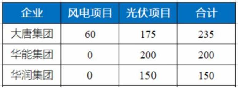 本次擬安排項目5個、585萬千瓦,其中光伏525萬千瓦、風(fēng)電60萬千瓦。分別由大唐集團(tuán)、華能集團(tuán)、華潤集團(tuán)獲得。