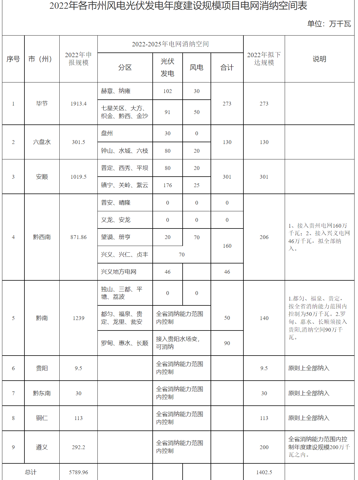 日前,貴州省能源局印發(fā)關于做好2022年風電光伏發(fā)電年度建設規(guī)模項目優(yōu)選上報有關工作的通知。通知指出,2022年度風電光伏發(fā)電年度建設規(guī)模項目申報工作已經(jīng)完成,各市(州)共上報風電光伏發(fā)電年度建設規(guī)模項目裝機5789.96萬千瓦,其中畢節(jié)、六盤水、安順、黔西南、黔南等資源富集區(qū)域為5345萬千瓦。