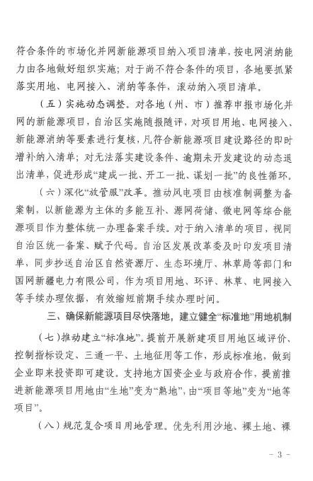 通知強(qiáng)調(diào),強(qiáng)化規(guī)劃布局指導(dǎo),用足用好新能源開發(fā)布局一張圖,與自治區(qū)電力發(fā)展規(guī)劃、可再生能源發(fā)展規(guī)劃銜接,確保項(xiàng)目選址符合國土空間規(guī)劃及“三區(qū)三線“等空間管控要求,研究確定新能源項(xiàng)目建設(shè)開發(fā)規(guī)劃布局和建設(shè)時(shí)序,為企業(yè)投資提供便利。