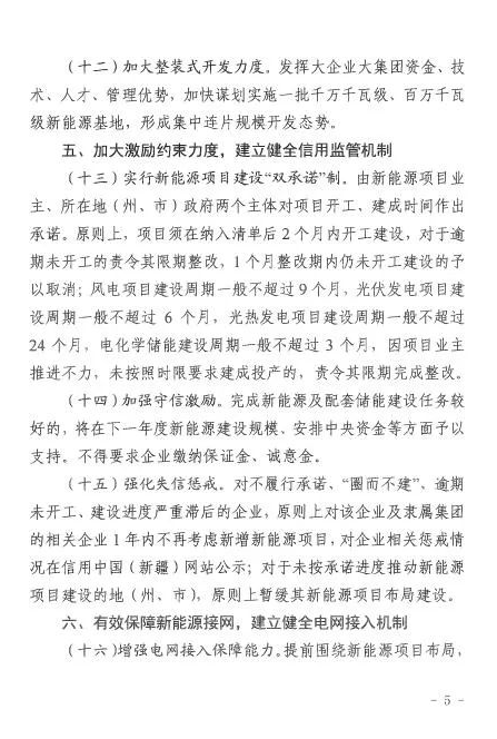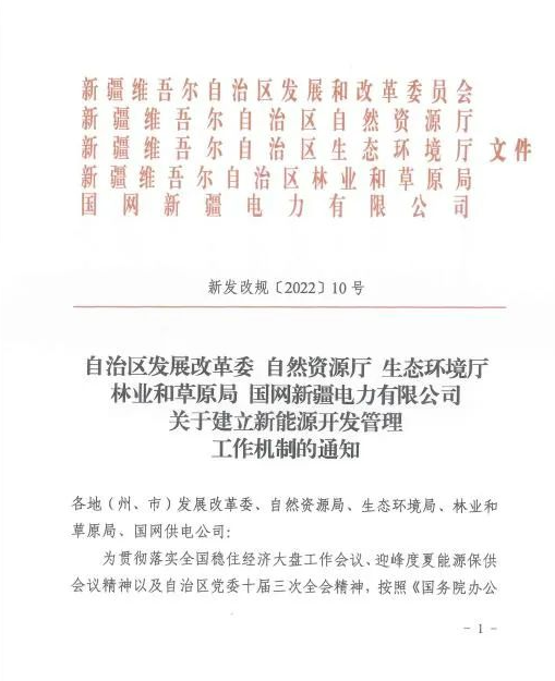 近日,新疆自治區(qū)發(fā)改委、自然資源廳、生態(tài)環(huán)境廳、林業(yè)和草原局、國網(wǎng)新疆電力聯(lián)合下發(fā)《關(guān)于建立新能源開發(fā)管理工作機(jī)制的通知》,發(fā)布新能源開發(fā)管理十大機(jī)制30條措施,旨在進(jìn)一步理順新能源項(xiàng)目建設(shè)工作機(jī)制,著力解決在新能源項(xiàng)目建設(shè)中存在的項(xiàng)目布局小而散碎片化、開工前手續(xù)辦理周期較長、新能源項(xiàng)目源網(wǎng)不匹配不同