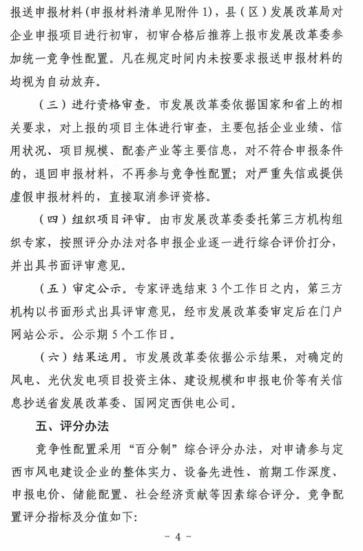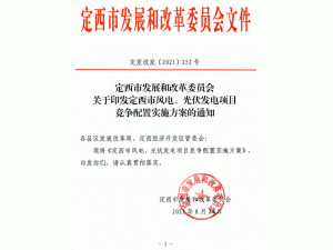 日前,根據(jù)《定西市發(fā)展和改革委員會關于印發(fā)定西市風電、光伏發(fā)電項目競爭配置實施方案的通知》,定西市安定區(qū)5萬千瓦集中式光伏發(fā)電項目進行公開競爭配置,要求單個風電、光伏發(fā)電項目規(guī)模不低于5萬千瓦(含)不超過10萬千瓦(含),申報一個發(fā)電項目需配套落戶一項產業(yè)。優(yōu)先支持風光儲一體化、多能互補項目鼓勵