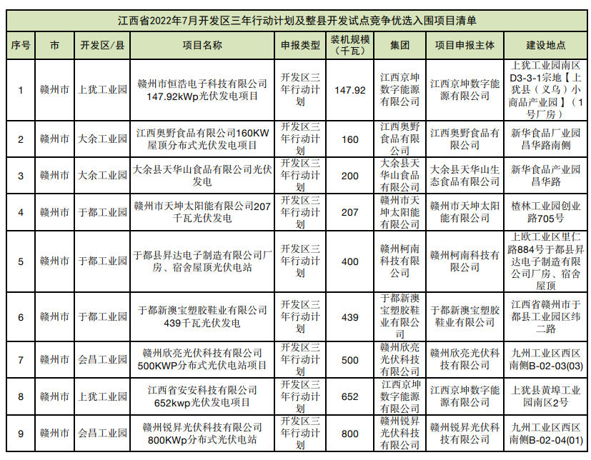 從江西省可再生能源規(guī)劃項(xiàng)目庫(kù)管理系統(tǒng)了解到,根據(jù)《江西省整體推進(jìn)開(kāi)發(fā)區(qū)屋頂光伏建設(shè)三年行動(dòng)計(jì)劃(2022-2024年)》與《江西省能源局關(guān)于進(jìn)一步做好整縣屋頂分布式光伏開(kāi)發(fā)試點(diǎn)工作的通知》要求,江西省能源局組織開(kāi)展了開(kāi)發(fā)區(qū)三年行動(dòng)計(jì)劃及整縣開(kāi)發(fā)試點(diǎn)項(xiàng)目7月競(jìng)爭(zhēng)性?xún)?yōu)選工作,江西省可再生能源信息中心對(duì)項(xiàng)目材料進(jìn)行合