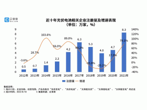 數(shù)據(jù)顯示,我國現(xiàn)存光伏電池相關(guān)企業(yè)38.8萬家。2022年上半年,我國新增光伏電池相關(guān)企業(yè)0.8萬家,同比微增3.6%。2020年、2021年分別同比增加17.5%、79.1%新增相關(guān)企業(yè)達(dá)4.7萬家、8.3萬家。近十年,我國光伏電池相關(guān)企業(yè)注冊量規(guī)模具有一定波動,2012年至2017年,注冊量穩(wěn)步增加,其中2014年注冊量增速最大,同比大幅增加103.6%達(dá)1.4萬家,隨后2015年增速放緩至56.0%,全年新增2.2萬家。