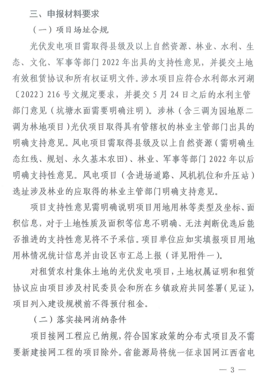 據(jù)江西省可再生能源信息中心:8月25日,江西省能源局發(fā)布關(guān)于開展風(fēng)電、光伏發(fā)電項目競爭優(yōu)選工作的通知。通知明確,支持建設(shè)條件落實且滿足電網(wǎng)接入消納條件的風(fēng)電、光伏發(fā)電項目“能建盡建”,切實提高優(yōu)選項目實際并網(wǎng)率和電網(wǎng)消納資源利用率。重點支持已(在)建燃煤電廠、為系統(tǒng)調(diào)峰進行靈活改造配置的新能源項目;建設(shè)條件已落實且取得各項手續(xù)并能按時開工的項目;可以共用升壓站或不新建升壓站的項目;以及符合江西省下發(fā)的《光伏發(fā)電、風(fēng)電項目開發(fā)工作指南(2022年)》規(guī)定的優(yōu)先發(fā)展方向的項目。