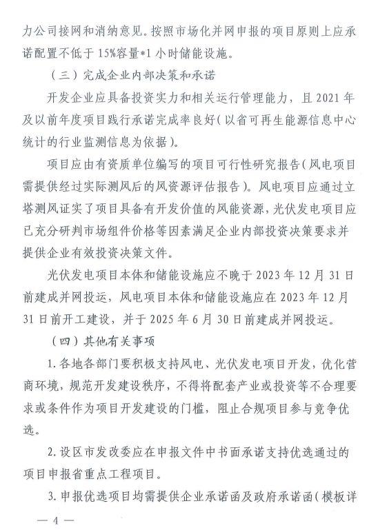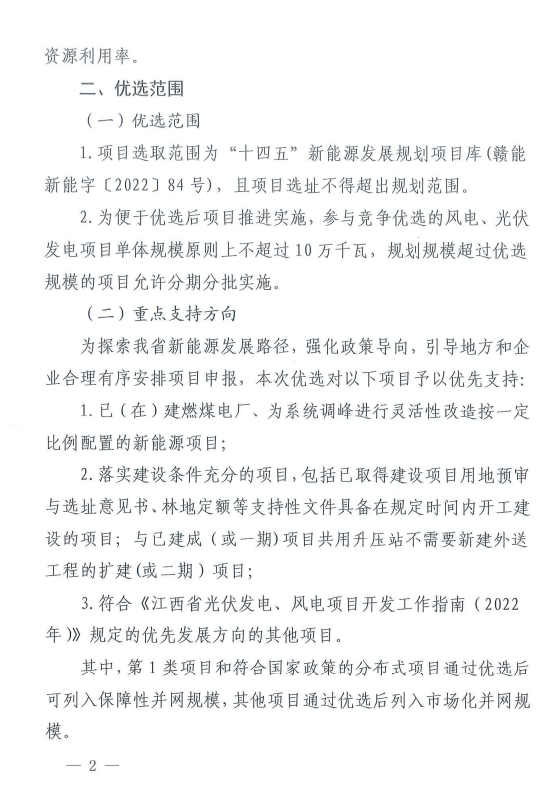 通知明確,本次優(yōu)選項目選取范圍為“十四五”新能源發(fā)展規(guī)劃項目庫(贛能新能字〔2022〕84號),且項目選址不得超出規(guī)劃范圍。為便于優(yōu)選后項目推進實施,參與競爭優(yōu)選的風(fēng)電、光伏發(fā)電項目單體規(guī)模原則上不超過10萬千瓦,規(guī)劃規(guī)模超過優(yōu)選規(guī)模的項目允許分期分批實施。