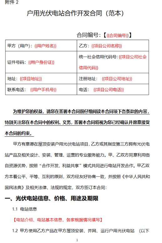 日前,中國光伏行業(yè)協(xié)會在充分征求各方面意見基礎(chǔ)上,編制發(fā)布了《戶用光伏產(chǎn)品銷售安裝合同(范本)》和《戶用光伏電站合作開發(fā)合同(范本)》,供居民用戶和光伏開發(fā)企業(yè)、戶用光伏經(jīng)銷商等各方參考。