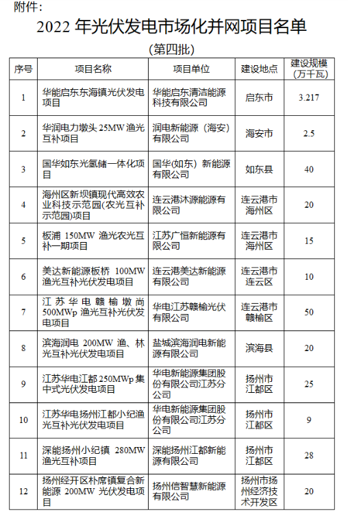 8月31日,江蘇省發(fā)展改革委公布了2022年光伏發(fā)電市場(chǎng)化并網(wǎng)項(xiàng)目(第四批)名單,共計(jì)12個(gè)項(xiàng)目,合計(jì)規(guī)模2427.17MW。