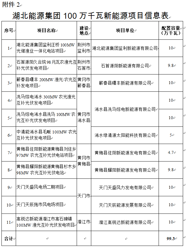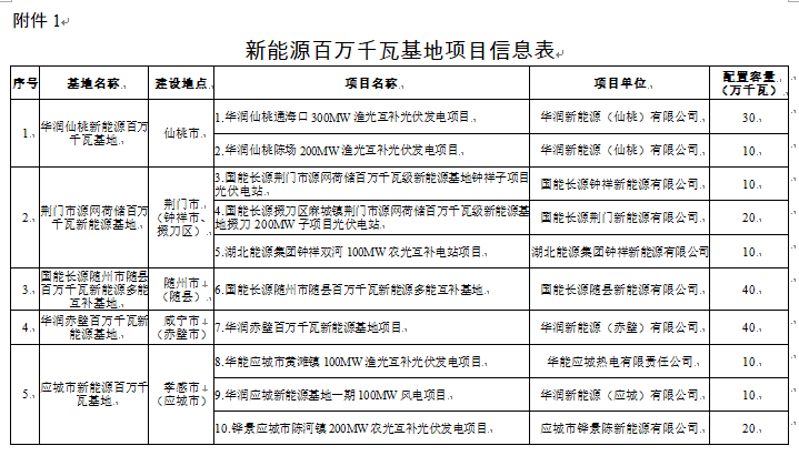 此次公布的新能源百萬千瓦基地項(xiàng)目應(yīng)在2023年底前全容量并網(wǎng)發(fā)電,湖北能源集團(tuán)100萬千瓦新能源項(xiàng)目應(yīng)在2024年底前全容量并網(wǎng)發(fā)電。其中,新能源百萬千瓦基地項(xiàng)目,包括華潤(rùn)仙桃新能源百萬千瓦基地、荊門市源網(wǎng)荷儲(chǔ)百萬千瓦新能源基地、應(yīng)城市新能源百萬千瓦基地等10個(gè),配置容量共400萬千瓦。湖北能源集團(tuán)100萬千瓦新能源項(xiàng)目,包括湖北能源集團(tuán)監(jiān)利汪橋100MW光儲(chǔ)漁業(yè)一體化電站項(xiàng)目、石首源陽(yáng)久合垸98兆瓦農(nóng)漁光互補(bǔ)光伏發(fā)電項(xiàng)目、蘄春縣曙豐200MW漁光/農(nóng)光互補(bǔ)發(fā)電項(xiàng)目等11個(gè),配置容量共99.3萬千瓦。