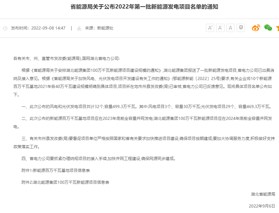 9月13日,湖北省能源局公布了2022年第一批新能源發(fā)電項(xiàng)目名單,風(fēng)電和光伏發(fā)電項(xiàng)目共計(jì)32個(gè),容量499.3萬千瓦。其中,風(fēng)電項(xiàng)目3個(gè)、容量30萬千瓦,光伏發(fā)電項(xiàng)目29個(gè)、容量469.3萬千瓦。此次公布的新能源百萬千瓦基地項(xiàng)目應(yīng)在2023年底前全容量并網(wǎng)發(fā)電,湖北能源集團(tuán)100萬千瓦新能源項(xiàng)目應(yīng)在2024年底前全容量并網(wǎng)