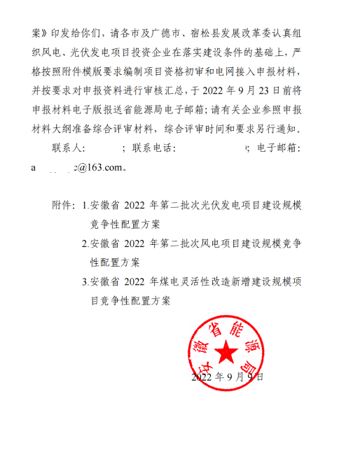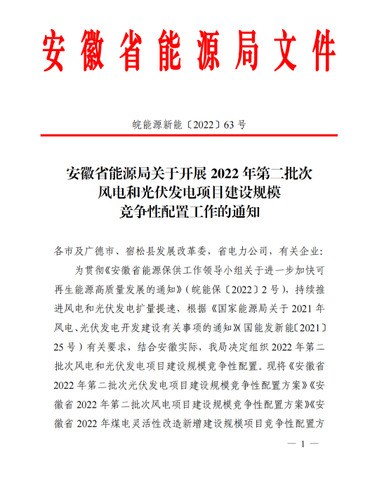 9月9日,安徽省能源局下發(fā)了《關(guān)于開展 2022 年第二批次風(fēng)電和光伏發(fā)電項目建設(shè)規(guī)模競爭性配置工作的通知》,此次光伏、風(fēng)電指標(biāo)各1.5GW,共計3GW。