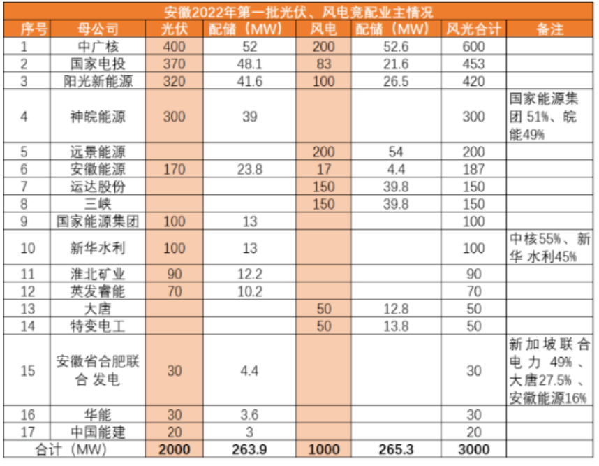 值得注意的是,在此前,安徽省已經(jīng)下發(fā)了《關(guān)于2022年第一批次風(fēng)電和光伏發(fā)電項目開發(fā)建設(shè)方案》,確定了光伏2GW、風(fēng)電1GW項目;隨后7月4日安徽省又追加了追加風(fēng)電和光伏發(fā)電項目建設(shè)規(guī)模200萬千瓦,其中風(fēng)電項目100萬千瓦、光伏項目100萬千瓦(安徽:第一批3GW基礎(chǔ)上再追加1GW光伏+1GW風(fēng)電建設(shè)規(guī)模)。第一批項目業(yè)主情況如下: