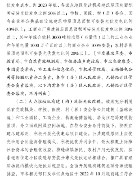 10月11日,江蘇無(wú)錫市政府發(fā)布《關(guān)于大力推進(jìn)全市光伏發(fā)電規(guī)模化開(kāi)發(fā)應(yīng)用的實(shí)施意見(jiàn)》!秾(shí)施意見(jiàn)》提出,“十四五”期間,對(duì)于完成新增并網(wǎng)目標(biāo),安排光伏發(fā)電補(bǔ)貼資金并落實(shí)補(bǔ)貼的地區(qū),市級(jí)自 2022年起分年度給予補(bǔ)助。對(duì)納入全國(guó)整縣(市、區(qū))屋頂分布式光伏開(kāi)發(fā)試點(diǎn)的地區(qū),最高按其年度實(shí)際發(fā)放光伏發(fā)電專項(xiàng)補(bǔ)貼總額的30%進(jìn)行補(bǔ)助;其他地區(qū)最高按照15%進(jìn)行補(bǔ)助。