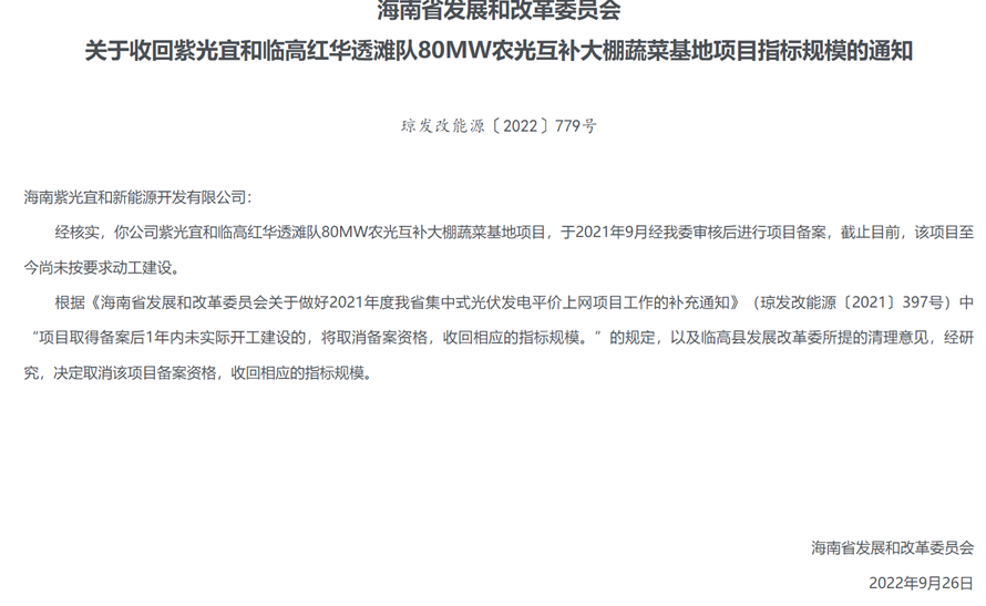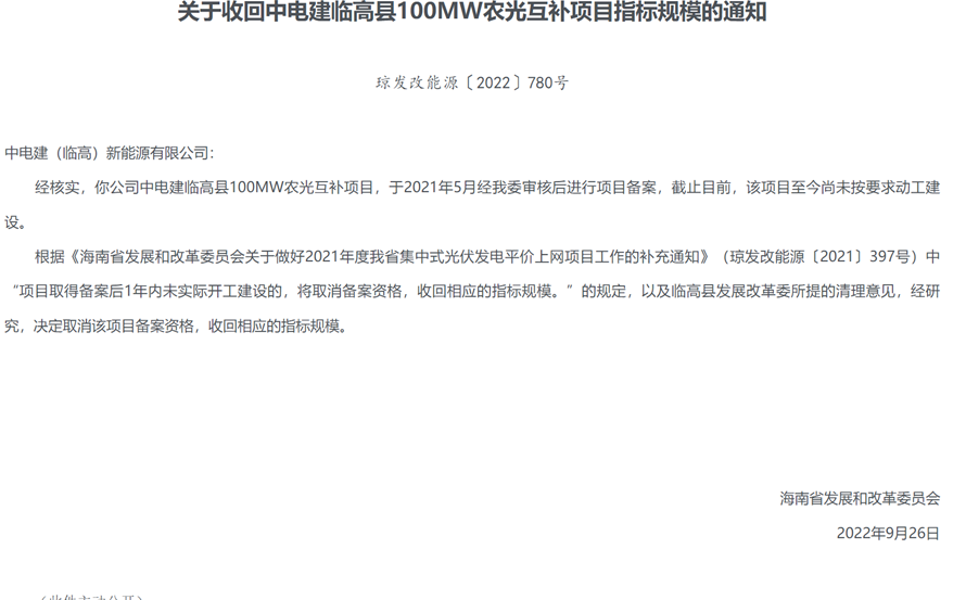 從海南省發(fā)改委官網(wǎng)獲悉:近日,海南省發(fā)改委發(fā)布《關(guān)于收回中電建臨高縣100MW農(nóng)光互補(bǔ)項(xiàng)目指標(biāo)規(guī)模的通知》和《關(guān)于收回紫光宜和臨高紅華透灘隊(duì)80MW農(nóng)光互補(bǔ)大棚蔬菜基地項(xiàng)目指標(biāo)規(guī)模的通知》,均因項(xiàng)目至今尚未按要求動工建設(shè),取消備案資格,收回相應(yīng)的指標(biāo)規(guī)模。經(jīng)核實(shí),中電建臨高縣100MW農(nóng)光互補(bǔ)項(xiàng)目,于2021年5月經(jīng)海南發(fā)