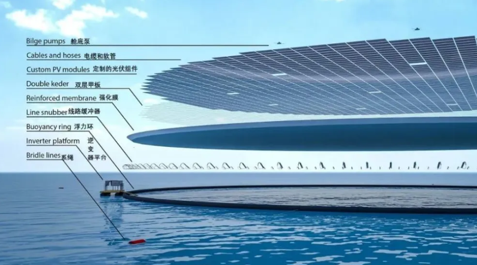 注意看整個(gè)光伏組件,是不是有點(diǎn)像大圓盤(pán)?這個(gè)圓盤(pán)就是光伏組件的平臺(tái),整個(gè)平臺(tái)由環(huán)形抗風(fēng)浪浮體、耐海洋環(huán)境高強(qiáng)彈性薄膜、光伏系統(tǒng)和風(fēng)光送出系統(tǒng)等組成。