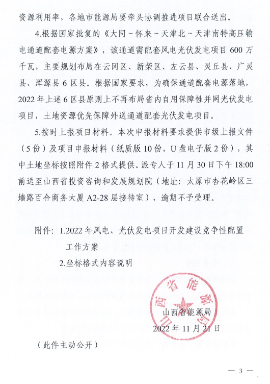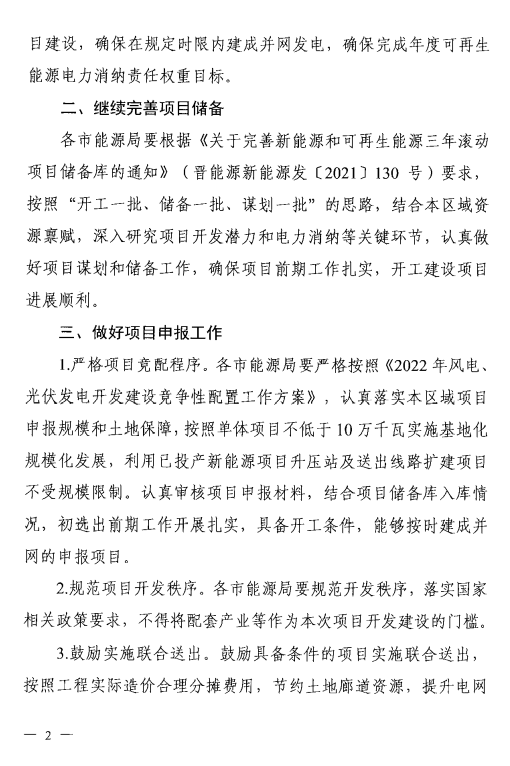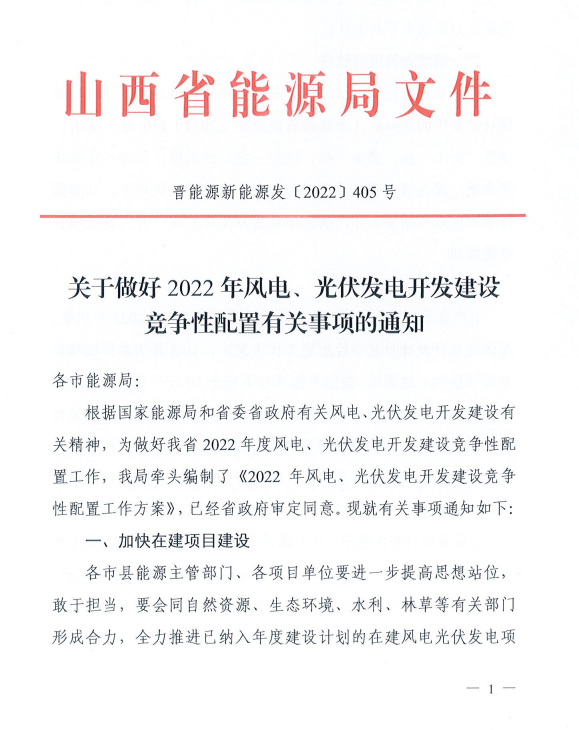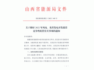 11月21日,山西省能源局印發(fā)《2022年風(fēng)電、光伏發(fā)電開發(fā)建設(shè)競爭先配置工作方案》,全力推進(jìn)已納入年度計(jì)劃的在建風(fēng)電光伏發(fā)電項(xiàng)目建設(shè)。