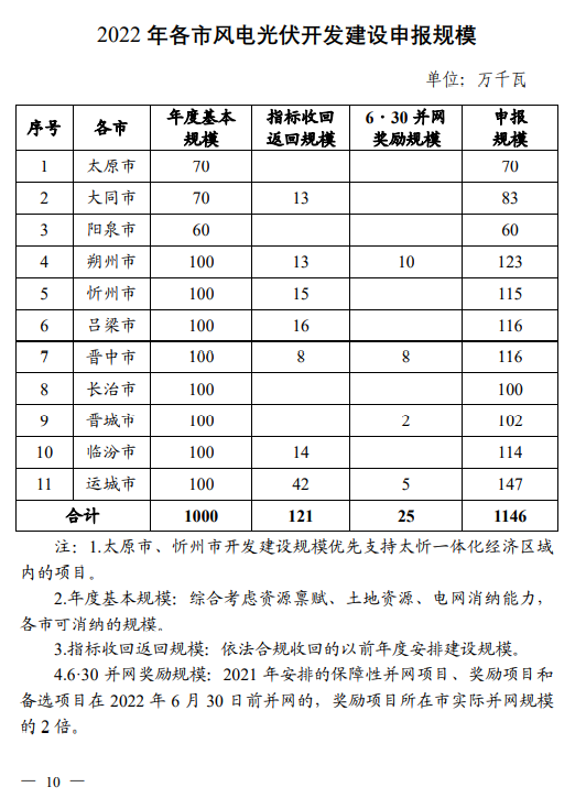 根據(jù)《方案》,2022年山西省安排風(fēng)電、光伏保障性并網(wǎng)年度規(guī)模1000萬千瓦,獎(jiǎng)勵(lì)規(guī)模146萬千瓦。
