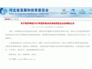 11月23日, 河北省發(fā)展和改革委員會(huì)發(fā)布《關(guān)于暫停申報(bào)2022年度風(fēng)電光伏發(fā)電項(xiàng)目企業(yè)名單的公示》,為進(jìn)一步加強(qiáng)風(fēng)電光伏發(fā)電項(xiàng)目管理,按照對(duì)存有逾期未全容量并網(wǎng)項(xiàng)目企業(yè),原則上在全省范圍內(nèi)暫停該項(xiàng)目相關(guān)企業(yè)當(dāng)年新增項(xiàng)目申報(bào)的政策要求,現(xiàn)將暫停申報(bào)2022年度保障類、市場(chǎng)化企業(yè)名單(共計(jì)23個(gè))予以公示。