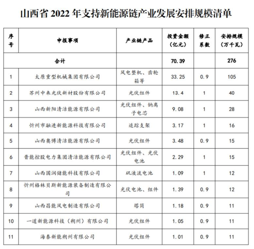 在各市和相關(guān)企業(yè)申報(bào)的基礎(chǔ)上,山西省能源局委托省投資咨詢和發(fā)展規(guī)劃院組織了2022年支持新能源產(chǎn)業(yè)發(fā)展風(fēng)電光伏發(fā)電建設(shè)規(guī)模評(píng)審,評(píng)審確定了17家企業(yè)符合安排標(biāo)準(zhǔn),擬安排風(fēng)電光伏建設(shè)規(guī)模372萬千瓦,納入年度建設(shè)計(jì)劃。其中:新能源產(chǎn)業(yè)鏈企業(yè)11個(gè)家,安排規(guī)模276萬千瓦。煤電調(diào)峰能力建設(shè)企業(yè)6家,安排96萬千瓦。