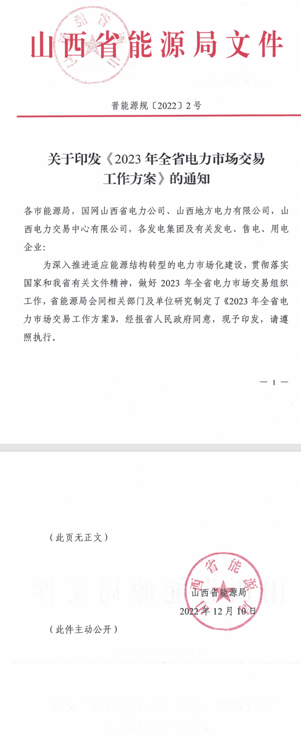 12月13日,山西省能源局印發(fā)2023 年全省電力市場(chǎng)交易工作方案。根據(jù)方案,2023 年,繼續(xù)開(kāi)展現(xiàn)貨市場(chǎng)連續(xù)結(jié)算試運(yùn)行,除居民、農(nóng)業(yè)用電外,全省工商業(yè)用電全部參與電力市場(chǎng)交易,交易規(guī)模預(yù)計(jì)在 1600 億千瓦時(shí)以上。同時(shí)明確,符合準(zhǔn)入條件的光伏發(fā)電(暫不含分布式光伏和扶貧光伏)、風(fēng)電機(jī)組(暫不含分散式