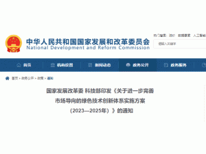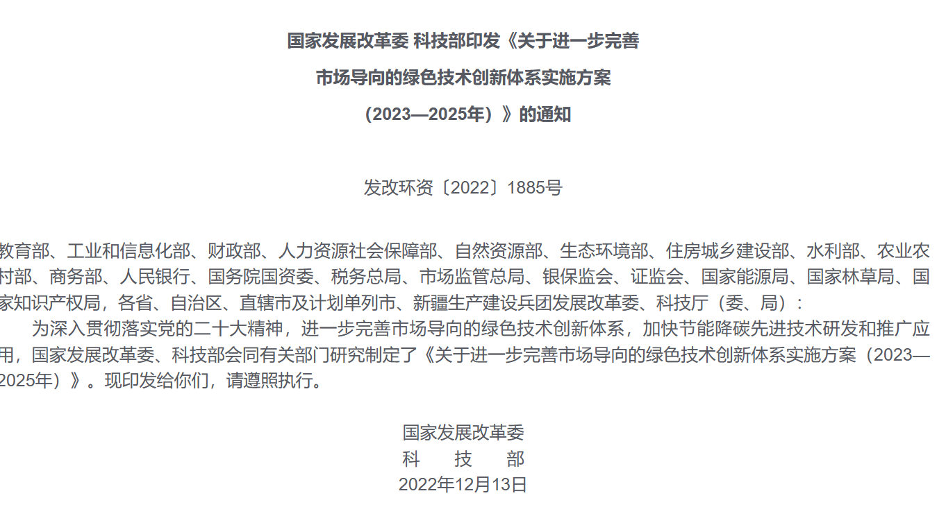 12月28日,國家發(fā)改委、科技部發(fā)布《關于進一步完善市場導向的綠色技術創(chuàng)新體系實施方案(2023—2025年)》(以下簡稱《方案》)的通知。