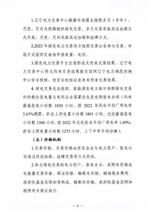 近日,遼寧省工信廳、遼寧省發(fā)改委,國家能源局東北監(jiān)管局聯(lián)合印發(fā)《2023年遼寧省綠電綠證交易工作方案》。方案明確,綠電交易優(yōu)先組織,新能源發(fā)電主體可參照綠電交易外的剩余發(fā)電量與電網(wǎng)企業(yè)簽署優(yōu)先發(fā)電購售電合同(風(fēng)電最高發(fā)電小時(shí)數(shù)1850小時(shí),按2022年風(fēng)電平均廠用電率2. 63%測(cè)算,折合上網(wǎng)電量小時(shí)數(shù)1801小時(shí)。