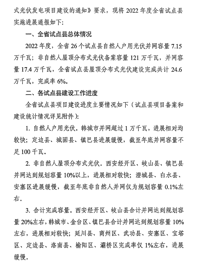 據(jù)榆林市發(fā)改委官網(wǎng),近期,陜西省發(fā)改委對(duì)全省整縣(市、區(qū))推進(jìn)屋頂分布式光伏發(fā)電試點(diǎn)縣2022年度項(xiàng)目建設(shè)進(jìn)展情況進(jìn)行了通報(bào)。根據(jù)通報(bào),2022年度,陜西省26個(gè)試點(diǎn)縣自然人戶用光伏并網(wǎng)容量7.15 萬(wàn)千瓦;非自然人屋頂分布式光伏備案容量121萬(wàn)千瓦,并網(wǎng)容量17.4萬(wàn)千瓦,全省試點(diǎn)縣屋頂分布式光伏建設(shè)完成共計(jì)24.6萬(wàn)千瓦,完成率6%。