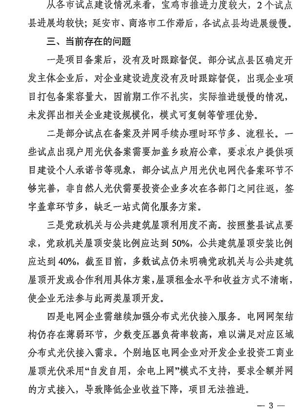 通報(bào)顯示,寶雞市推進(jìn)力度較大,2個(gè)試點(diǎn)縣進(jìn)展均較快;延安市、商洛市工作滯后,各試點(diǎn)縣均進(jìn)展緩慢。其中通報(bào)榆陽(yáng)區(qū)、定邊縣合計(jì)并網(wǎng)容量完成率僅1%左右。
