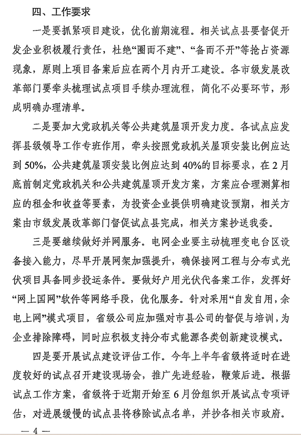 通報(bào)要求,要抓緊項(xiàng)目建設(shè),優(yōu)化前期流程。要加大黨政機(jī)關(guān)等公共建筑屋頂開(kāi)發(fā)力度。繼續(xù)做好并網(wǎng)保障服務(wù)。開(kāi)展試點(diǎn)建設(shè)專項(xiàng)評(píng)估。加快推進(jìn)屋頂分布式光伏項(xiàng)目,確保試點(diǎn)目標(biāo)任務(wù)按期高效完成。