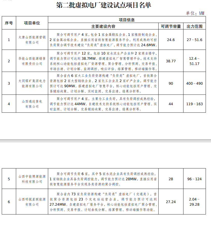 4月18日,山西省能源局發(fā)布關(guān)于第二批虛擬電廠建設試點項目的公示,根據(jù)委托國網(wǎng)山西電科院對申報的一批虛擬電廠項目實施方案進行評估的結(jié)果,擬確定6個方案相對成熟的項目作為第二批虛擬電廠建設試點項目,現(xiàn)予以公示,公示期為5個工作日。